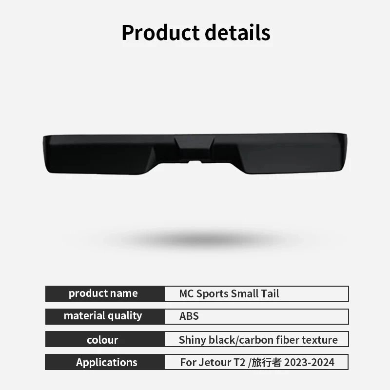 Elevate the style and performance of your Chery Jetour Traveller T2 with our Carbon Fiber Pattern Tail Wing Spoiler. Designed to enhance your vehicle's aerodynamics while adding a touch of modern elegance, this spoiler is the perfect accessory for any car enthusiast.