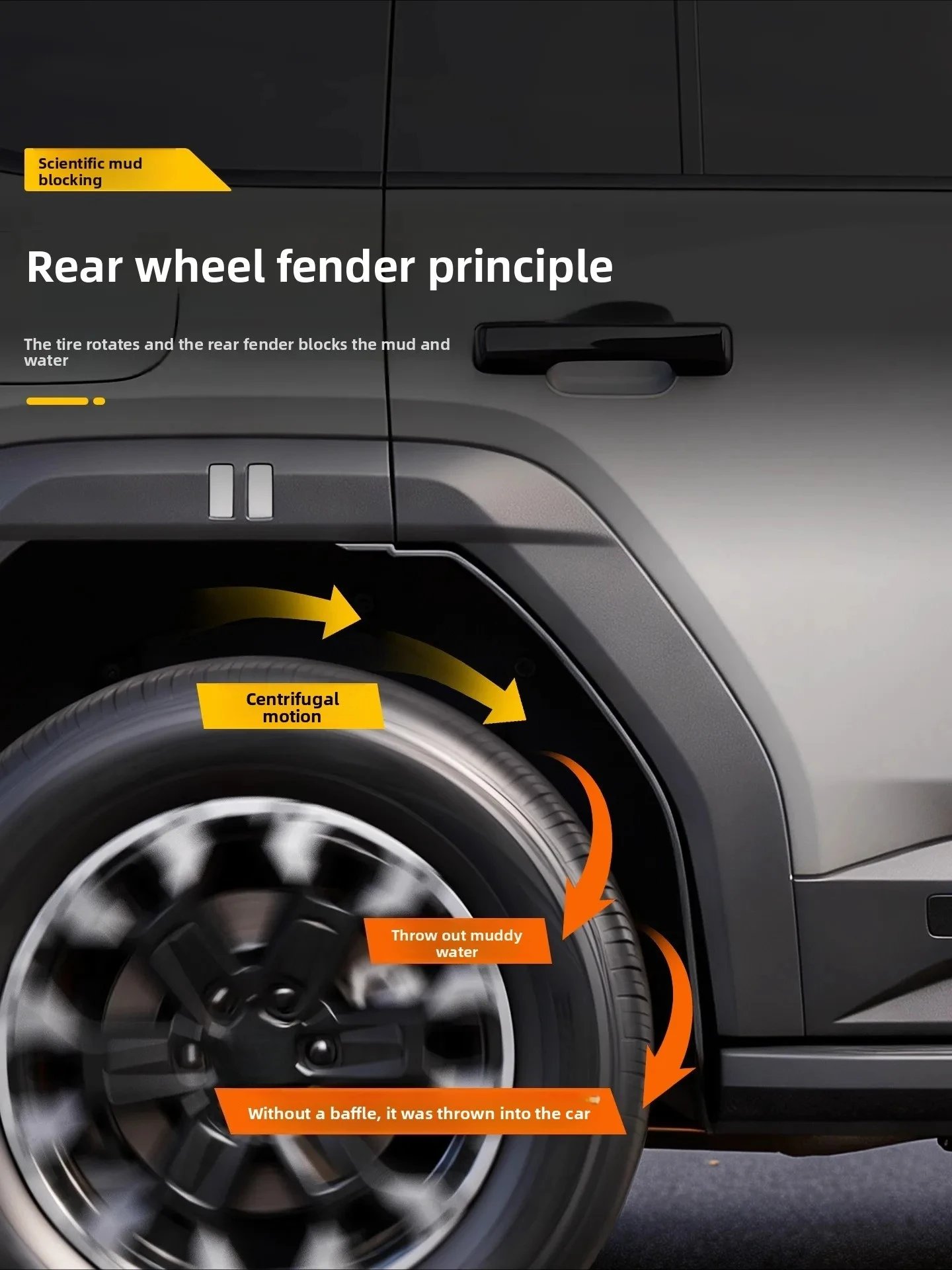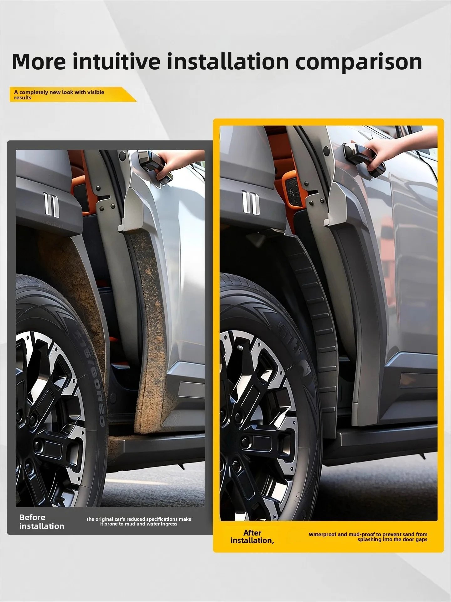 - Effective Splash Guards: Prevents mud, rocks, and water from splashing onto your vehicle and keeps it clean.