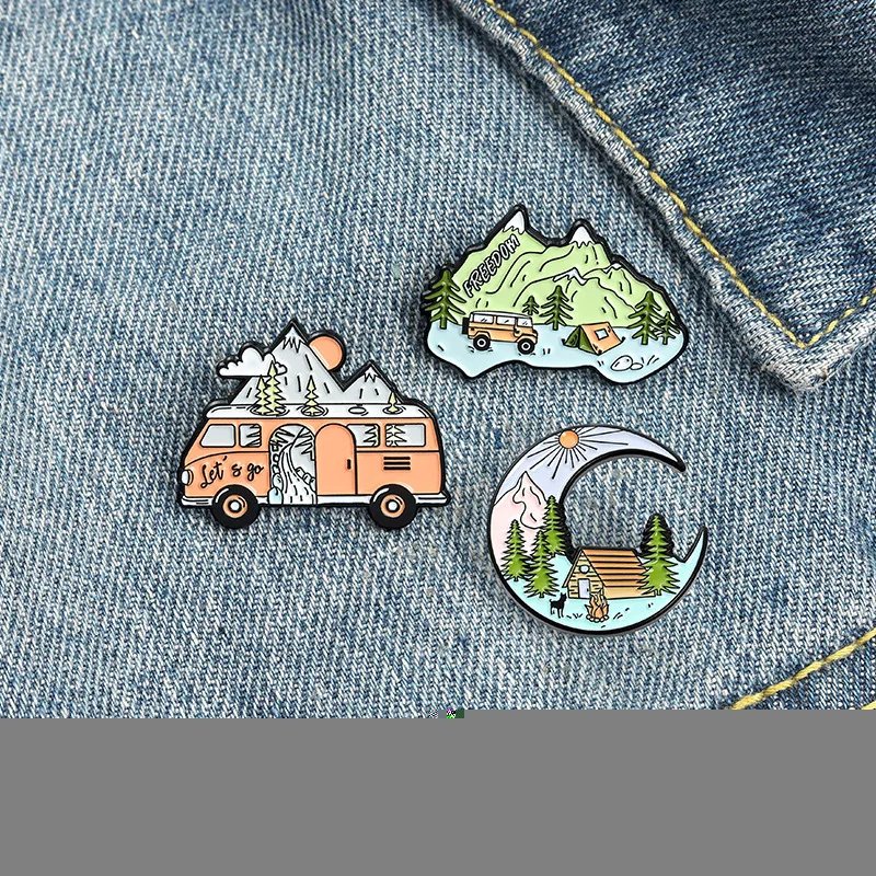 Keywords: hiking brooch, mountain peak pin, travel badge, outdoor accessories, alloy pins.